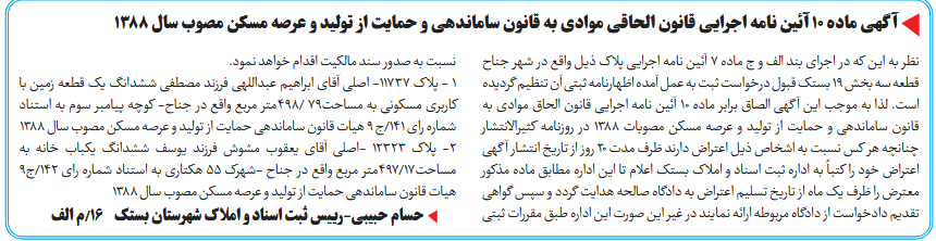 نظر به این که در اجرای بند الف و ج ماده ۷ آئین نامه اجرایی پلاک ذیل واقع در شهر جناح قطعه سه بخش ۱۹ بستک قبول درخواست ثبت به عمل آمده اظهارنامه ثبتی آن تنظیم گردیده است. لذا به موجب این آگهی الصاق برابر ماده ۱۰ آئین نامه اجرایی قانون الحاق موادی به قانون ساماندهی و حمایت از تولید و عرصه مسکن مصوبات ۱۳۸۸ در روزنامه کثیرالانتشار چنانچه هر کس نسبت به اشخاص ذیل اعتراض دارند ظرف مدت ۲۰ روز از تاریخ انتشار آگهی اعتراض خود را کتباً به اداره ثبت اسناد و املاک بستک اعلام تا این اداره مطابق ماده مذکور معترض را ظرف یک ماه از تاریخ تسلیم اعتراض به دادگاه صالحه هدایت گردد و سپس گواهی تقدیم دادخواست از دادگاه مربوطه ارائه نمایند در غیر این صورت این اداره طبق مقررات ثبتی نسبت به صدور سند مالکیت اقدام خواهد نمود.
