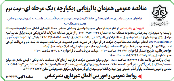 مناقصه عمومی همزمان با ارزیابی (یکپارچه ) یک مرحله ای-نوبت دومفراخوان مدیریت راهبری و سامان بخشی حفظ نگهداری فضای سبز ابنیه و تأسیسات وابسته به شهرداری بندرعباس محدوده منطقه سه