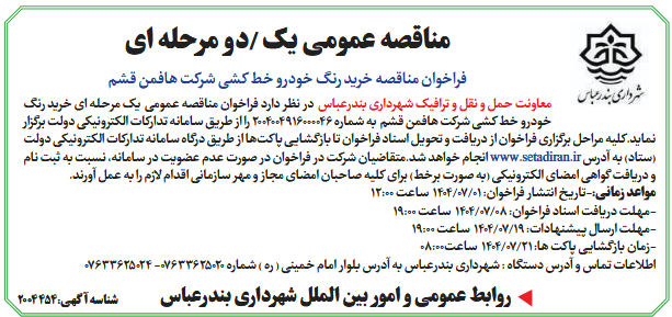 معاونت حمل و نقل و ترافیک شهرداری بندرعباس در نظر دارد فراخوان مناقصه عمومی یک مرحله ای خرید رنگ خودرو خط کشی شرکت هافمن قشم به شماره 2004004916000046 را از طریق سامانه تدارکات الکترونیکی دولت برگزار نماید.کلیه مراحل برگزاری فراخوان از دریافت و تحویل اسناد فراخوان تا بازگشایی پاکتها از طریق درگاه سامانه تدارکات الکترونیکی دولت (ستاد) به آدرس www.setadiran.ir انجام خواهد شد.متقاضیان شرکت در فراخوان در صورت عدم عضویت در سامانه، نسبت به ثبت نام و دریافت گواهی امضای الکترونیکی (به صورت برخط) برای کلیه صاحبان امضای مجاز و مهر سازمانی اقدام لازم را به عمل آورند.