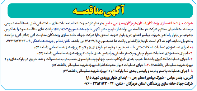شرکت جهاد خانه سازی رزمندگان استان هرمزگان (سهامی خاص ) در نظر دارد جهت انجام عملیات های ساختمانی ذیل به مناقصه عمومی برساند .متقاضیان محترم شرکت در مناقصه می توانند از تاریخ نشر آگهی تا پنجشنبه مورخ03/07/1404 پاکت های مناقصه خود را به آدرس بندرعباس بلوار راه آهن شهرک پیامبر اعظم (ص) بلوار شهید اسحق دارا شرکت جهاد خانه سازی رزمندگان معاونت فنی (دفتر فنی) مراجعه و تحویل نمایند.لازم به ذکر است تاریخ بازگشایی پاکت ها شنبه مورخ 5/7/1404 می باشد. تلفن تماس جهت هماهنگی:4 - 07633521123