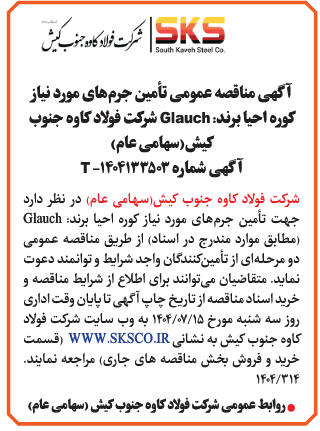 شركت فولاد کاوه جنوب کیش(سهامی عام) در نظر دارد جهت تأمین جرمهای مورد نیاز کوره احیا برند: Glauch (مطابق موارد مندرج در اسناد) از طريق مناقصه عمومى دو مرحلهای از تأمینکنندگان واجد شرایط و توانمند دعوت نماید. متقاضیان میتوانند برای اطلاع از شرایط مناقصه و خرید اسناد مناقصه از تاریخ چاپ آگهی تا پایان وقت اداری روز سه شنبه مورخ 15/07/1404 به وب سایت شرکت فولاد کاوه جنوب کیش به نشانی WWW.SKSCO.IR (قسمت خرید و فروش بخش مناقصه های جاری) مراجعه نمایند.