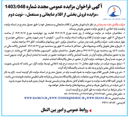 آگهی فراخوان مزایده عمومی مجدد شماره 048/1403«مزایده فروش بخشی از اقلام ضایعاتی و مستعمل» -نوبت دوم