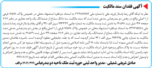 نظر به اینکه آقای رضا پاسلار فرزند علی با شماره ملی ۳۳۹۱۸۷۶۸۱۲ به استناد دو فقره استشهاد محلی در خصوص پلاک ۱۶۵۶۸ فرعی از ۱ اصلی واقع در بخش دو بندرعباس مدعی شده است که سند مالکیت سه دانگ مشاع از ششدانگ یک واحد تجاری در دفتر ۷۷۷ صفحه ۱۴۶ ذیل ثبت ۱۳۰۵۶۸ به نامش ثبت وسند مالکیت به شماره چاپی ۹۹۴۴۴۴ سری الف /۹۴ و آقای رهام پاسلار فرزند رضا با شماره ملی ۰۴۴۱۲۷۵۷۸۸ به استناد دو فقره استشهاد محلی در خصوص پلاک ۱۶۵۶۸ فرعی از ۱ اصلی واقع در بخش دو بندرعباس مدعی شده است که سند مالکیت سه دانگ مشاع از ششدانگ یک واحد تجاری در دفتر ۷۷۷ صفحه ۱۴۹ ذیل ثبت ۱۳۰۵۶۹ به نامش ثبت وسند مالکیت به شماره چاپی ۹۹۴۴۴۵ سری الف / ۹۴ صادر گردیده است که به علت جابجایی مفقود گردیده است. نامبرده تقاضای صدور سند مالکیت المثنی نموده است لذا باستناد ماده ۱۲۰ آئین نامه اصلاحی و تبصره ذیل آن بدینوسیله اعلام میشود هر کس مدعی انجام معامله نسبت به پلاک مذکور و وجود اصل اسناد مالکیت در نزد خود میباشد بایستی از تاریخ انتشار آگهی ظرف مدت ده روز اعتراض خود راضمن ارائه اسناد مالکیت به این اداره تسلیم واخذ نماید بدیهی است پس از انقضای مهلت قانونی مذکور و عدم وصول اعتراض و یا وصول اعتراض و عدم ارائه اسناد نسبت به صدور اسناد مالكيت المثنى بنام متقاضی اقدام خواهد شد.تاریخ:02/07/1404
