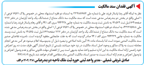 نظر به اینکه آقای رضا پاسلار فرزند علی با شماره ملی ۳۳۹۱۸۷۶۸۱۲ به استناد دو فقره استشهاد محلی در خصوص پلاک ۱۶۵71 فرعی از ۱ اصلی واقع در بخش دو بندرعباس مدعی شده است که سند مالکیت سه دانگ مشاع از ششدانگ یک واحد آپارتمان در دفتر ۷۷۷ صفحه164ذیل ثبت ۱۳۰۵74 به نامش ثبت وسند مالکیت به شماره چاپی ۹۹۴۴38 سری الف /۹۴ و آقای رهام پاسلار فرزند رضا با شماره ملی ۰۴۴۱۲۷۵۷۸۸ به استناد دو فقره استشهاد محلی در خصوص پلاک ۱۶۵71 فرعی از ۱ اصلی واقع در بخش دو بندرعباس مدعی شده است که سند مالکیت سه دانگ مشاع از ششدانگ یک واحد آپارتمان در دفتر ۷۷۷ صفحه167ذیل ثبت ۱۳۰۵75 به نامش ثبت وسند مالکیت به شماره چاپی ۹۹۴۴39 سری الف / ۹۴ صادر گردیده است که به علت جابجایی مفقود گردیده است. نامبرده تقاضای صدور سند مالکیت المثنی نموده است لذا باستناد ماده ۱۲۰ آئین نامه اصلاحی و تبصره ذیل آن بدینوسیله اعلام میشود هر کس مدعی انجام معامله نسبت به پلاک مذکور و وجود اصل اسناد مالکیت در نزد خود میباشد بایستی از تاریخ انتشار آگهی ظرف مدت ده روز اعتراض خود راضمن ارائه اسناد مالکیت به این اداره تسلیم واخذ نماید بدیهی است پس از انقضای مهلت قانونی مذکور و عدم وصول اعتراض و یا وصول اعتراض و عدم ارائه اسناد نسبت به صدور اسناد مالكيت المثنى بنام متقاضی اقدام خواهد شد.تاریخ:02/07/1404