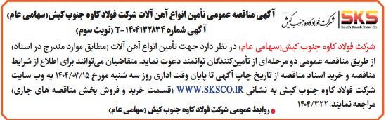 شركت فولاد کاوه جنوب کیش(سهامی عام) در نظر دارد جهت تأمین انواع آهن آلات (مطابق موارد مندرج در اسناد) از طريق مناقصه عمومى دو مرحلهای از تأمینکنندگان توانمند دعوت نماید. متقاضیان میتوانند برای اطلاع از شرایط مناقصه و خرید اسناد مناقصه از تاریخ چاپ آگهی تا پایان وقت اداری روز سه شنبه مورخ 15/07/1404 به وب سایت شرکت فولاد کاوه جنوب کیش به نشانی WWW.SKSCO.IR (قسمت خرید و فروش بخش مناقصه های جاری) مراجعه نمایند.