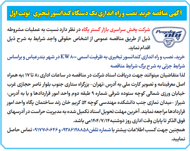 آگهی مناقصه خرید، نصب و راه اندازی یک دستگاه کندانسور تبخیری-نوبت اول