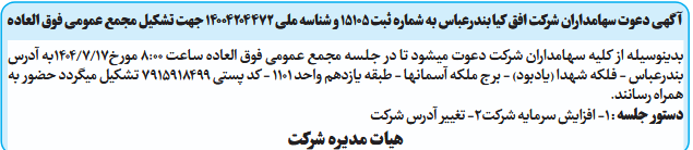 بدینوسیله از کلیه سهامداران شرکت دعوت میشود تا در جلسه مجمع عمومی فوق العاده ساعت 8:۰۰ مورخ17/7/1404به آدرس بندرعباس - فلکه شهدا (یادبود) - برج ملکه آسمانها - طبقه یازدهم واحد ۱۱۰۱ - کد پستی ۷۹۱۵۹۱۸۴۹۹ تشکیل میگردد حضور به همراه رسانند.