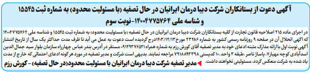 در اجرای ماده 215 اصلاحیه قانون تجارت از کلیه بستانکاران شرکت دیبا درمان ایرانیان در حال تصفیه (با مسئولیت محدود) به شماره ثبت 15545 و شناسه ملی 14004775764 که اگهی انحلال آن در صفحه 9 روزنامه رسمی کشور به شماره 23286 مورخ13/12/1403درج گردیده است دعوت به عمل می آید تا ظرف مدت حداکثر یک سال از تاریخ انتشار آگهی نوبت اول با ارائه مدارک مثبته ادعای خود به مدیر تصفیه آقای کورش رزم به شماره همراه 09129376521 مستقر در آدرس بندر عباس چهارراه سازمان بلوار سید جمال الدين اسدآبادی کوچه مهیار7، پاساژ ناصر ،طبقه 3 واحد ،10 کدپستی 7918893398 مراجعه نمایند. بدیهی است شرکت و مدیر تصفیه در مورد هر گونه ادعای احتمالی که خارج از مدت یاد شده به شرکت منعکس گردد، مسئولیتی نخواهند داشت.