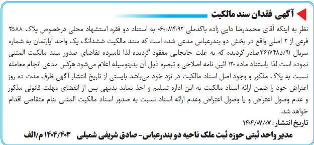 نظر به اینکه آقای محمدرضا دایی زاده باکدملی 0600814092 به استناد دو فقره استشهاد محلی درخصوص پلاک 2588 فرعی از ۲ اصلی واقع در بخش دو بندرعباس مدعی شده است که سند مالکیت ششدانگ یک واحد آپارتمان به شماره سریال 91/د361748صادر گردیده که به علت جابجایی مفقود گردیده لذا نامبرده تقاضای صدور سند مالکیت المثنی نموده است لذا باستناد ماده ۱۲۰ آئین نامه اصلاحی و تبصره ذیل آن بدینوسیله اعلام میشود هرکس مدعی انجام معامله نسبت به پلاک مذکور و وجود اصل اسناد مالکیت در نزد خود میباشد بایستی از تاریخ انتشار آگهی ظرف مدت ده روز اعتراض خود را ضمن ارائه اسناد مالکیت به این اداره تسلیم و اخذ نماید بدیهی پس از انقضای مهلت قانونی مذکور