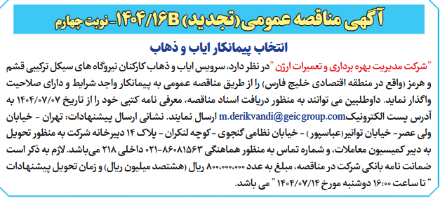 “شرکت مدیریت بهره برداری و تعمیرات ارژن “در نظر دارد، سرویس ایاب و ذهاب کارکنان نیروگاه های سیکل ترکیبی قشم و هرمز (واقع در منطقه اقتصادی خلیج فارس) را از طریق مناقصه عمومی به پیمانکار واجد شرایط و دارای صلاحیت واگذار نماید. داوطلبین می توانند به منظور دریافت اسناد مناقصه، معرفی نامه کتبی خود را از تاریخ 07/07/1404 به آدرس پست الکترونیکm.derikvandi@geicgroup.com ارسال نمایند. نشانی ارسال پیشنهادات: تهران - خیابان ولی عصر- خیابان توانیر(عباسپور) - خیابان نظامی گنجوی - کوچه لنکران - پلاک 14 دبیرخانه شرکت به منظور تحویل به دبیر کمیسیون معاملات، و شماره تماس به منظور هماهنگی 86081563-021 داخلی 218 میباشد. لازم به ذکر است ضمانت نامه بانکی شرکت در مناقصه، مبلغ به عدد 800،000،000 ریال (هشتصد میلیون ریال) و زمان تحویل پیشنهادات ” تا ساعت 16:00 دوشنبه مورخ 14/07/1404 “ می باشد.
