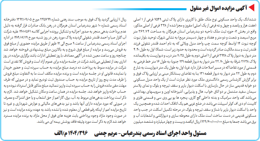 ششدانگ یک واحد مسکونی نوع ملک طلق با کاربری دارای پلاک ثبتی ۷۵۴۹ فرعی از ۱ اصلی (هفت هزار و پانصد و چهل و نه فرعی از یک اصلی) مفروز و مجزا شده از ۳۳۸ فرعی از اصلی مذکور، واقع در بخش ۰۲ حوزه ثبت ملک ناحیه دو بندرعباس استان هرمزگان به مساحت ۳۶۲.۷۴ متر مربع (سیصد و شصت و دو متر و هفتاد و چهار دسیمتر مربع) به نشانی شهرک توحید بلوار نبوت کوچه نبوت ۱۴ اواسط کوچه سمت چپ واحد منزل ویلائی که به نام احمد قلندر شقوئی فرزند قلندر ثبت و سند مالکیت صادر گردیده است و محدود به حدود زیر است: شمالا: اول به طول ۴.۴۰ متر دیوار به دیوار پلاک ۳۹۲۸ فرعی از ۱ اصلی دوم به طول ۱۱.۳۵ متر درب و دیواریست به باقیمانده پلاک ۲۷۳۸ شرقا: به طول ۲۲.۷۰ متر دیوار به دیوار قطعه ۱۲۹ جنوبا: به طول ۱۶ متر خط فرضی به قسمتی از مورد تقاضا که در مسیر اصلاحات قرار دارد غربا: اول به طول یک متر دیواریست به شارع دوم به طول ۲۲ متر دیوار به دیوار قطعه ۱۳۱ بنا به تقاضای بستانکار مبنی بر ارزیابی پلاک فوق و برابر گزارش کارشناس رسمی دادگستری ملک مورد نظر عبارت است از یک واحد منزل مسکونی دو خوابه قدیمی ساز در حال بازسازی با اسکلت دیوار باربر و سقف تیرچه و بلوک و نمای پلاستر سیمان سفید مشتمل بر دو اتاق خواب، هال و پذیرایی، آشپزخانه اوپن و سرویسهای بهداشتی میباشد کف واحد سرامیک و بدنه داخلی گچ کاری، پنجره ها یو پی وی سی و قسمتی فلزی و کابینت ام دی اف کولر اسپیلت میباشد در ضلع غربی هم یک اتاقک احداث شده و همچنین یک واحد با اسکلت دیوار باربر با شناژ و سقف تیرچه و بلوک در مرحله تکمیل اسکلت در جنب واحد مسکونی قدیمی در دست ساخت است ملک دارای محوطه سازی و دیوارکشی و انشعابات آب و برق میباشد جمعا به مبلغ 000/000/600/124) ریال (یکصد و بیست و چهار میلیارد و ششصد میلیون ریال ) ارزیابی گردید پلاک فوق به موجب سند رهنی شماره ۲۴۵۷۹۹ مورخ 05/۰۹/1392 دفترخانه اسناد رسمی شماره ۱۰ شهر بندرعباس استان هرمزگان در رهن بانک صادرات قرار گرفته به دلیل عدم پرداخت بدهی منجر به صدور اجرائیه و تشکیل پرونده اجرایی کلاسه ۱۴۰۱۰۱۵۶۱ علیه شرکت آب گلزار صبا و احمد قلندر شقوئی گردیده پلاک مورد رهن در روز شنبه مورخ 19/۰۷/1404 در اداره اجرای اسناد رسمی بندرعباس از ساعت ۹ صبح الی ۱۲ ظهر از طریق مزایده حضوری از مبلغ فوق به فروش میرسد و مزایده از مبلغ فوق شروع و به بالاترین مبلغ پیشنهادی فروخته خواهد شد چنانچه روز و ساعت معین شده در آگهی مصادف با روز تعطیلی ادارات باشد برگزاری مزایده در روز اداری بعد از تعطیلی میباشد شرکت در جلسه مزایده برای عموم آزاد است و فروش کلا نقدی است شرکت در مزایده منوط به پرداخت ده درصد مبلغ مزایده به حساب سپرده ثبت و حضور خریدار یا نماینده قانونی او در جلسه مزایده است و برنده مزایده مکلف است ما به التفاوت مبلغ فروش را ظرف مدت پنج روز از تاریخ مزایده به حساب صندوق ثبت تودیع نماید و در صورتی که ظرف مهلت مقرر مانده فروش را به حساب سپرده ثبت واریز ننمائید مبلغ مذکور قابل استرداد نبوده و به حساب خزانه واریز خواهد شد. جلسه مزایده در همان ساعت و مکان تشکیل خواهد شد . لازم به ذکر است پرداخت بدهیهای مربوط به ،آب، برق، گاز اعم از حق انشعاب و یا حق اشتراک و مصرف در صورتی که مورد مزایده دارای آنها باشد و نیز بدهیهای مالیاتی و عوارض شهرداری و غیره تا تاریخ مزایده اعم از اینکه رقم قطعی آن معلوم شده یا نشده باشد به عهده برنده مزایده است و نیز در صورت وجود مازاد وجوه پرداختی بابت هزینه های فوق از محل مازاد به برنده مزایده مسترد خواهد شد لازم به ذکر است مورد وثیقه فاقد پوشش بیمه ای می باشد.