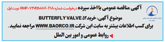 آگهی مناقصه عمومی نوبت اولموضوع آگهی: خرید52 BUTTERFLY VALVE