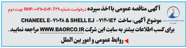 آگهی مناقصه عمومی نوبت دومموضوع آگهی: ساخت 71401E4- SHELL EJ & 71028-CHANEEL E