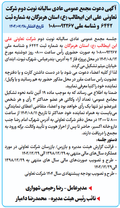 جلسه مجمع عمومی عادی سالیانه نوبت دوم شرکت تعاونی علی ابن ابیطالب (ع) استان هرمزگان به شماره ثبت 6442 و شناسه ملی 10800092267 به صورت حضوری رأس ساعت 08:00 روز دوشنبه مورخ 12/08/1404 در محل پروژه فاز 2 به آدرس: بندرعباس، شهرک نبوت، ابتدای خیابان میثم تشکیل می گردد.