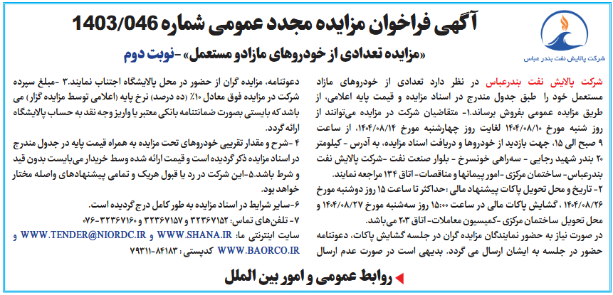 شرکت پالایش نفت بندرعباس در نظر دارد تعدادی از خودروهای مازاد مستعمل خود را طبق جدول مندرج در اسناد مزایده و قیمت پایه اعلامی، از طریق مزایده عمومی بفروش برساند.۱- متقاضیان شرکت در مزایده میتوانند از روز شنبه مورخ 10/08/1404 لغایت روز چهارشنبه مورخ 14/08/1404، از ساعت