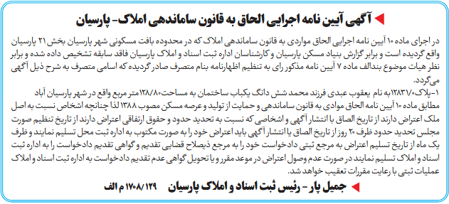در اجرای ماده ۱۰ آیین نامه اجرایی الحاق مواردی به قانون ساماندهی املاک که در محدوده بافت مسکونی شهر پارسیان بخش ۲۱ پارسیان واقع گردیده است و برابر گزارش بنیاد مسکن پارسیان و کارشناسان اداره ثبت اسناد و املاک پارسیان فاقد سابقه تشخیص داده شده و برابر نظر هیات موضوع بندالف ماده ۷ آیین نامه مذکور رای به تنظیم اظهارنامه بنام متصرف صادر گردیده که اسامی متصرف به شرح ذیل آگهی میگردد.