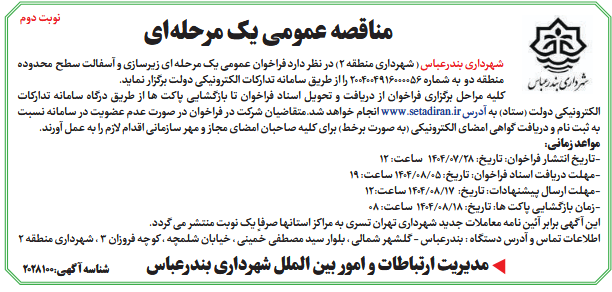 شهرداری بندرعباس ( شهرداری منطقه 2) در نظر دارد فراخوان عمومی یک مرحله ای زیرسازی و آسفالت سطح محدوده منطقه دو به شماره 2004004916000056 را از طریق سامانه تدارکات الکترونیکی دولت برگزار نماید.