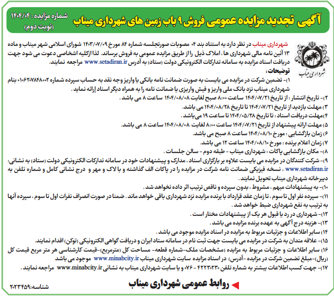 شهرداری میناب در نظر دارد به استناد بند 04 مصوبات صورتجلسه شماره 84 مورخ 09/07/1403 شورای اسلامی شهر میناب و ماده 13 آئین نامه مالی شهرداری ها ، املاک ذیل را از طریق مزایده عمومی به فروش برساند. لذا ازكلیه اشخاصی دعوت می شود جهت دریافت اسناد مزایده به سامانه تدارکات الکترونیکی دولت (ستاد) به آدرس www.setadiran.ir مراجعه نمایند.