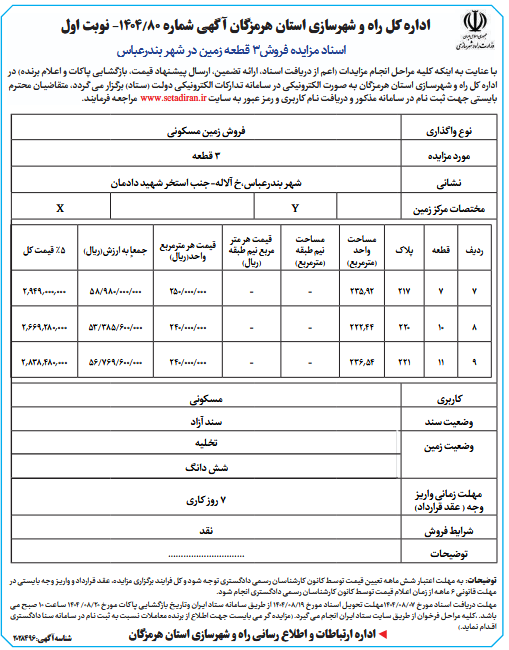 اسناد مزایده فروش3 قطعه زمین در شهر بندرعباس نوبت اول