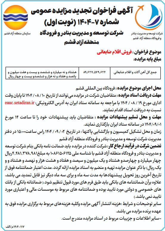 آگهی فراخوان تجدید مزایده عمومی (نوبت اول) موضوع فراخوان : فروش اقلام ضایعاتی