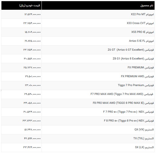 شرکت مدیران خودرو فهرست جدید قیمت محصولات برندهای امویام، فونیکس و اکستریم را ویژه آبان ۱۴۰۴ منتشر کرد.