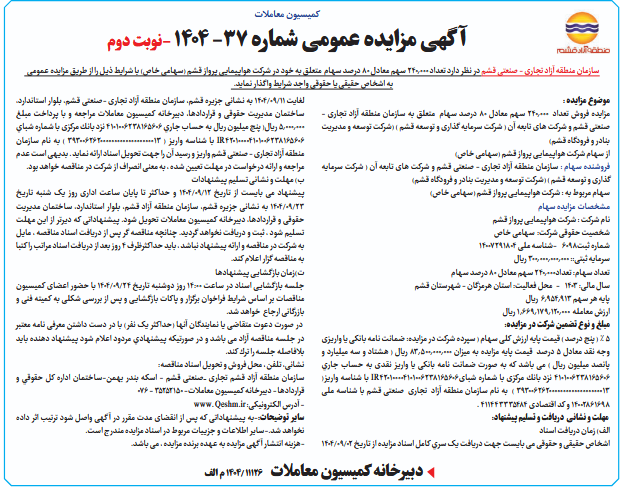 سازمان منطقه آزاد تجاری - صنعتی قشم در نظر دارد تعداد 240.000 سهم معادل 80 درصد سهام متعلق به خود در شرکت هواپیمایی پرواز قشم (سهامی خاص) با شرایط ذیل را از طریق مزایده عمومی به اشخاص حقیقی یا حقوقی واجد شرایط واگذار نماید.