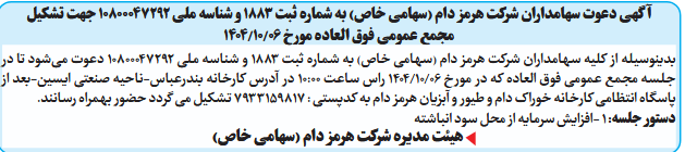 بدینوسیله از کلیه سهامداران شرکت هرمز دام (سهامی خاص) به شماره ثبت ۱۸۸۳ و شناسه ملی ۱۰۸۰۰۰۴۷۲۹۲ دعوت میشود تا در جلسه مجمع عمومی فوق العاده که در مورخ 06/۱۰/1404 راس ساعت ۱۰:۰۰ در آدرس کارخانه بندرعباس-ناحیه صنعتی ایسین-بعد از پاسگاه انتظامی کارخانه خوراک دام و طیور و آبزیان هرمز دام به کدپستی : ۷۹۳۳۱۵۹۸۱۷ تشکیل می گردد حضور بهمراه رسانند.