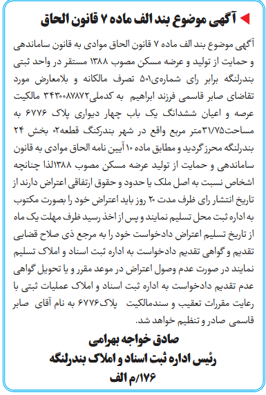 آگهی موضوع بند الف ماده ۷ قانون الحاق موادی به قانون ساماندهی و حمایت از تولید و عرضه مسکن مصوب ۱۳۸۸ مستقر در واحد ثبتی بندرلنگه برابر رای شمارهی501 تصرف مالکانه و بلامعارض مورد تقاضای صابر قاسمی فرزند ابراهیم به کدملی3430087872 مالکیت عرصه و اعیان ششدانگ یک باب چهار دیواری پلاک 6776 به مساحت75/31متر مربع واقع در شهر بندرکنگ قطعه02 بخش ۲۴ بندرلنگه محرز گردید و مطابق ماده ۱۰ آیین نامه الحاق موادی به قانون ساماندهی و حمایت از تولید عرضه مسکن مصوب ۱۳۸۸لذا چنانچه اشخاص نسبت به اصل ملک یا حدود و حقوق ارتفاقی اعتراض دارند از تاریخ انتشار رای ظرف مدت ۲۰ روز باید اعتراض خود را بصورت مکتوب به اداره ثبت محل تسلیم نمایند و پس از اخذ رسید ظرف مهلت یک ماه از تاریخ تسلیم اعتراض دادخواست خود را به مرجع ذی صلاح قضایی تقدیم و گواهی تقدیم دادخواست به اداره ثبت اسناد و املاک تسلیم نمایند در صورت عدم وصول اعتراض در موعد مقرر و یا تحویل گواهی عدم تقدیم دادخواست به اداره ثبت اسناد و املاک عملیات ثبتی با رعایت مقررات تعقیب و سندمالکیت پلاک6776 به نام آقای صابر قاسمی صادر و تنظیم خواهد شد.