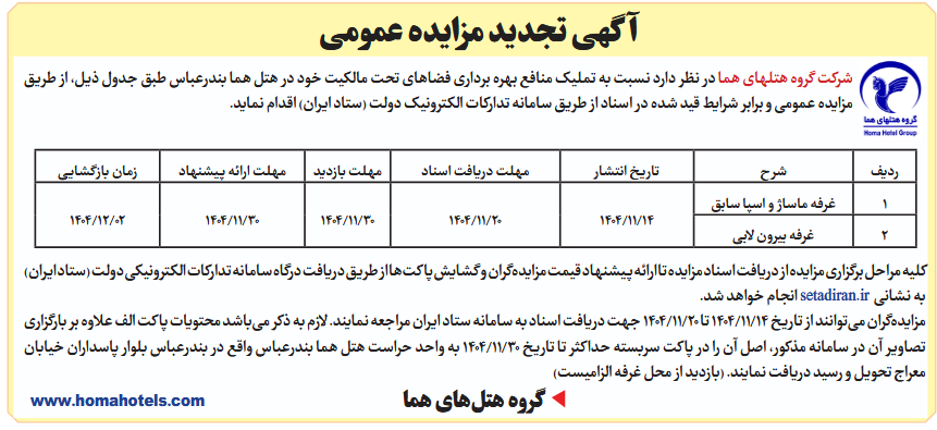 شرکت گروه هتلهای هما در نظر دارد نسبت به تملیک منافع بهره برداری فضاهای تحت مالکیت خود در هتل هما بندرعباس طبق جدول ذیل، از طریق مزایده عمومی و برابر شرایط قید شده در اسناد از طریق سامانه تدارکات الکترونیک دولت (ستاد ایران) اقدام نماید.