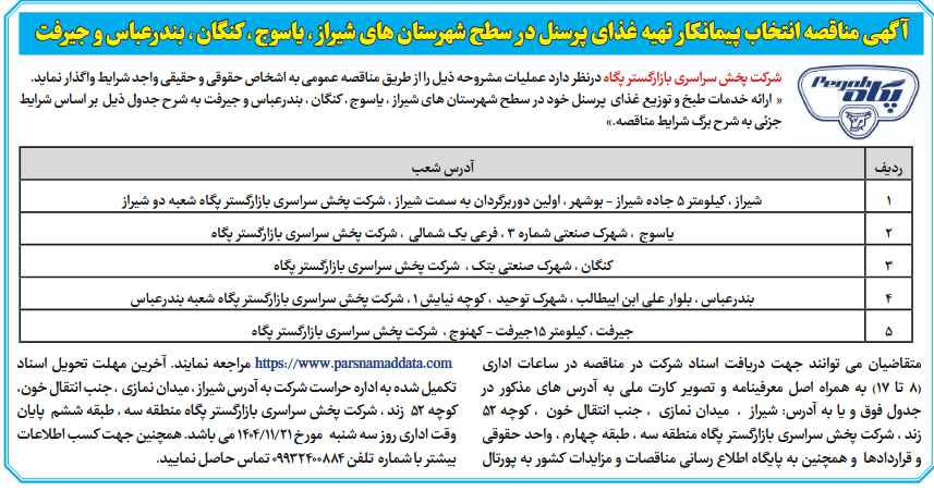 https://www.parsnamaddata.com مراجعه نمایند. آخرین مهلت تحویل اسناد تکمیل شده به اداره حراست شرکت به آدرس شیراز ، میدان نمازی ، جنب انتقال خون، کوچه 52 زند ، شرکت پخش سراسری بازارگستر پگاه منطقه سه ، طبقه ششم پایان وقت اداری روز سه شنبه مورخ 21/11/1404 می باشد. همچنین جهت کسب اطلاعات بیشتر با شماره تلفن 09932400884 تماس حاصل نمایید.