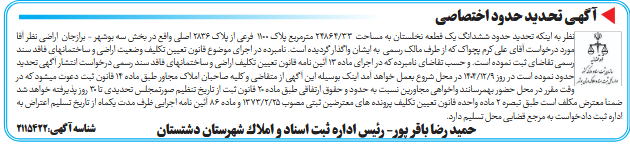 نظر به اینکه تحدید حدود ششدانگ یک قطعه نخلستان به مساحت 33/24864 مترمربع پلاک 1100 فرعی از پلاک 2836 اصلی واقع در بخش سه بوشهر - برازجان اراضی نظر آقا مورد درخواست آقای علی کرم پچواک که از طرف مالک رسمی به ایشان واگذار گردیده است. نامبرده در اجرای موضوع قانون تعیین تکلیف وضعیت اراضی و ساختمانهای فاقد سند رسمی تقاضای ثبت نموده است. و حسب تقاضای نامبرده که در اجرای ماده 13 آئین نامه قانون تعیین تکلیف اراضی و ساختمانهای فاقد سند رسمی درخواست انتشار آگهی تحدید حدود نموده است در روز 9/12/1404 در محل شروع بعمل خواهد آمد اینک بوسیله این آگهی از متقاضی و کلیه صاحبان املاک مجاور طبق ماده 14 قانون ثبت دعوت میشود که در وقت مقرر در محل حضور بهمرسانند واخواهی مجاورین نسبت به حدود و حقوق ارتفاقی طبق ماده 20 قانون ثبت از تاریخ تنظیم صورتمجلس تحدیدی تا 30 روز پذیرفته خواهد شد ضمنا معترض مکلف است طبق تبصره 2 ماده واحده قانون تعیین تکلیف پرونده های معترضین ثبتی مصوب 25/2/1373 و ماده 86 آئین نامه اجرایی ظرف مدت یکماه از تاریخ تسلیم اعتراض به اداره ثبت دادخواست به مرجع قضایی محل تسلیم دارد.