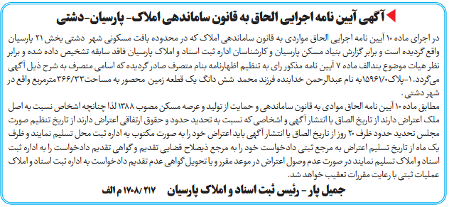 در اجرای ماده ۱۰ آیین نامه اجرایی الحاق مواردی به قانون ساماندهی املاک که در محدوده بافت مسکونی شهر دشتی بخش ۲۱ پارسیان واقع گردیده است و برابر گزارش بنیاد مسکن پارسیان و کارشناسان اداره ثبت اسناد و املاک پارسیان فاقد سابقه تشخیص داده شده و برابر نظر هیات موضوع بندالف ماده ۷ آیین نامه مذکور رای به تنظیم اظهارنامه بنام متصرف صادر گردیده که اسامی متصرف به شرح ذیل آگهی میگردد. 1-پلاک0/15961به نام عبدالرحمن خدابنده فرزند محمد شش دانگ یک قطعه زمین محصور به مساحت33/366مترمربع واقع در