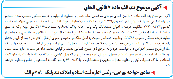 آگهی موضوع بند الف ماده ۷ قانون الحاق موادی به قانون ساماندهی و حمایت از تولید و عرضه مسکن مصوب ۱۳۸۸ مستقر در واحد ثبتی بندرلنگه برابر رای شمارهی719 تصرف مالکانه و بلامعارض مورد تقاضای فاطمه اسماعیلی فرزند احمد به کدملی3440108333 مالکیت عرصه و اعیان ششدانگ یک باب خانه پلاک0/6801 به مساحت60 /257متر مربع واقع در شهر بندرکنگ قطعه02 بخش ۲۴ بندرلنگه محرز گردید و مطابق ماده ۱۰ آیین نامه الحاق موادی به قانون ساماندهی و حمایت از تولید عرضه مسکن مصوب ۱۳۸۸لذا چنانچه اشخاص نسبت به اصل ملک یا حدود و حقوق ارتفاقی اعتراض دارند از تاریخ انتشار رای ظرف مدت ۲۰ روز باید اعتراض خود را بصورت مکتوب به اداره ثبت محل تسلیم نمایند و پس از اخذ رسید ظرف مهلت یک ماه از تاریخ تسلیم اعتراض دادخواست خود را به مرجع ذی صلاح قضایی تقدیم و گواهی تقدیم دادخواست به اداره ثبت اسناد