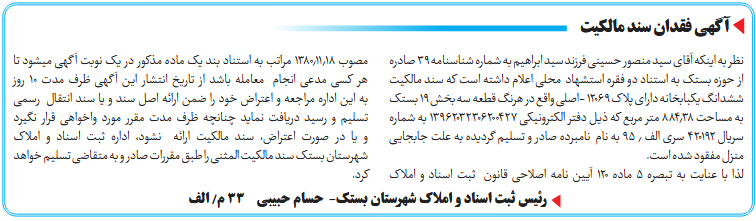 نظر به اینکه آقای سید منصور حسینی فرزند سید ابراهیم به شماره شناسنامه ۳۹ صادره از حوزه بستک به استناد دو فقره استشهاد محلی اعلام داشته است که سند مالکیت ششدانگ یکبابخانه دارای پلاک ۱۲۰۶۹ -اصلی واقع در هرنگ قطعه سه بخش ۱۹ بستک به مساحت ۸۸4٫۳۸ متر مربع که ذیل دفتر الکترونیکی ۱۳۹۶۲۰۳۲۳۰۶۲۰۰۴۲۷ به شماره سریال ۴۲۰۱۹۲ سری الف ٫ ۹۵ به نام نامبرده صادر و تسلیم گردیده به علت جابجایی منزل مفقود شده است.