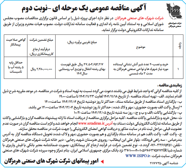 1 خريد و نصب 04 عدد شير آتش نشاني ايستاده مورد نياز شهرك ها و نواحی صنعتی هرمزگان به مدت 3 ماه شمسی 47.504.652.217 ريال طبق فهرست بهای رشته انتقال و توزيع آب روستايی سال1404 2.380.000.000 ريال